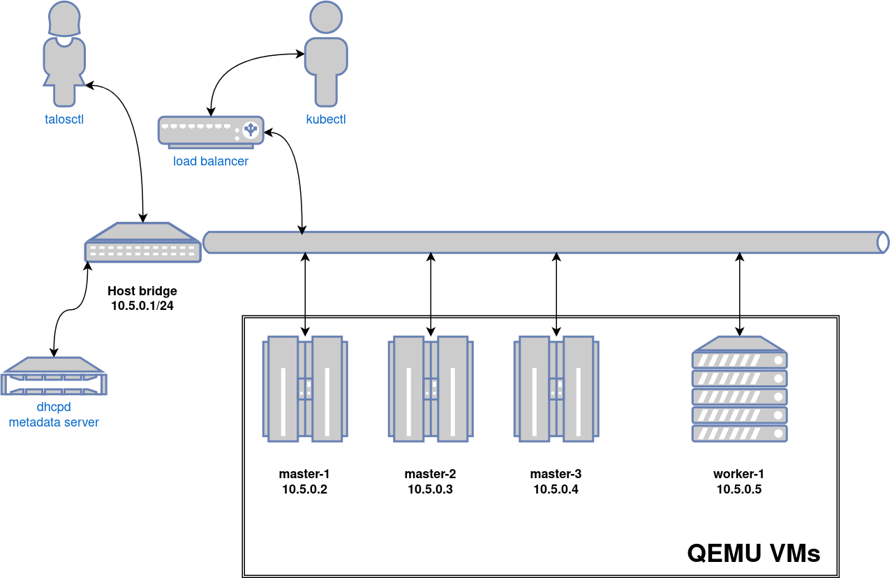 A bridge interface will be created, and assigned the default IP 10.5.0.1. Each node will be directly accessible on the subnet specified at cluster creation time. A loadbalancer runs on 10.5.0.1 by default, which handles loadbalancing for the Kubernetes APIs.