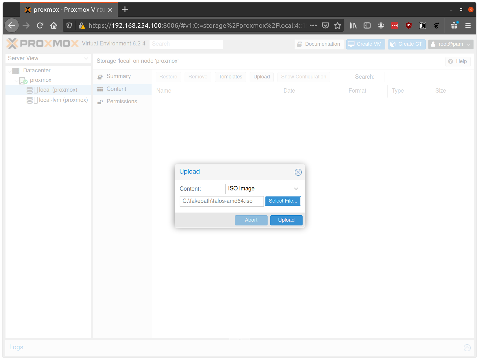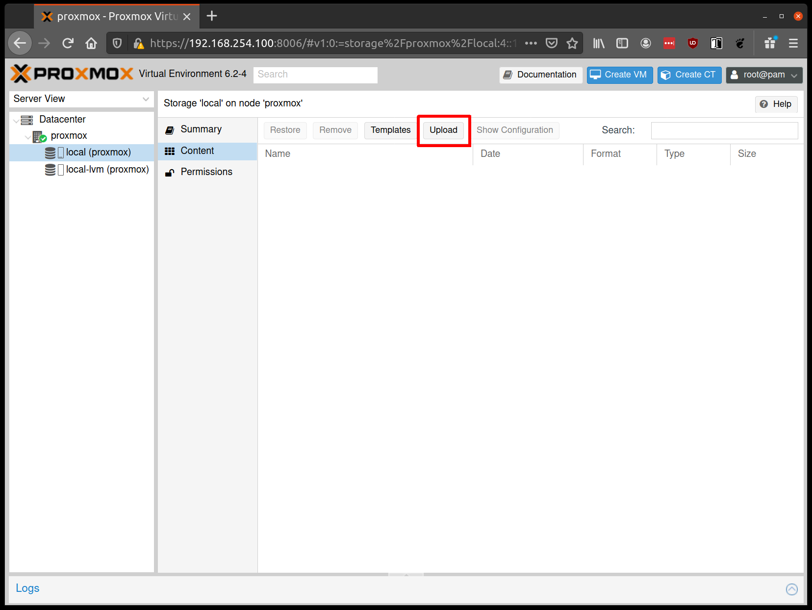 From the Proxmox UI, select the “local” storage and enter the “Content” section. Click the “Upload” button: