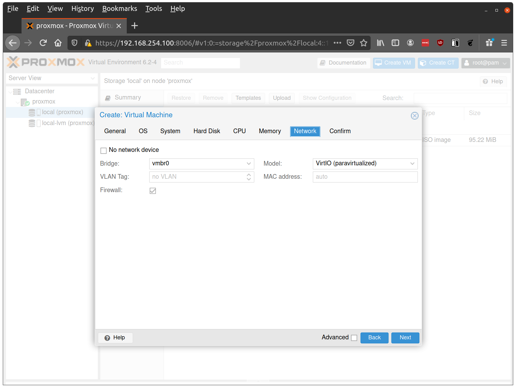 Keep the default values for networking, verifying that the VM is set to come up on the bridge interface: