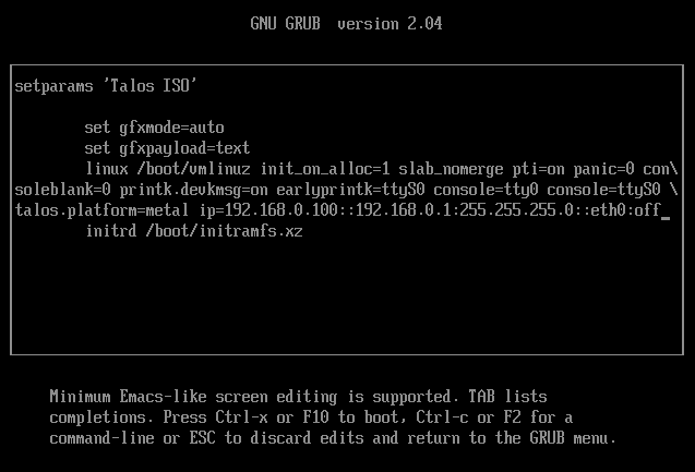 linux /boot/vmlinuz init_on_alloc=1 slab_nomerge pti=on panic=0 consoleblank=0 printk.devkmsg=on earlyprintk=ttyS0 console=tty0 console=ttyS0 talos.platform=metal ip=192.168.0.100::192.168.0.1:255.255.255.0::eth0:off