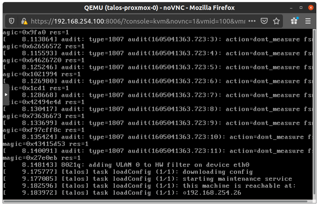 You should now see some action in the Proxmox console for this VM. Talos will be installed to disk, the VM will reboot, and then Talos will configure the Kubernetes control plane on this VM.